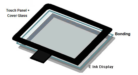 The cover glass of a display is attached to the E Ink display using either tape or an optical clear adhesive (OCA). OCA bonding ensures that the touch panel, cover glass, and E Ink display are securely held together without smudging the display glass.