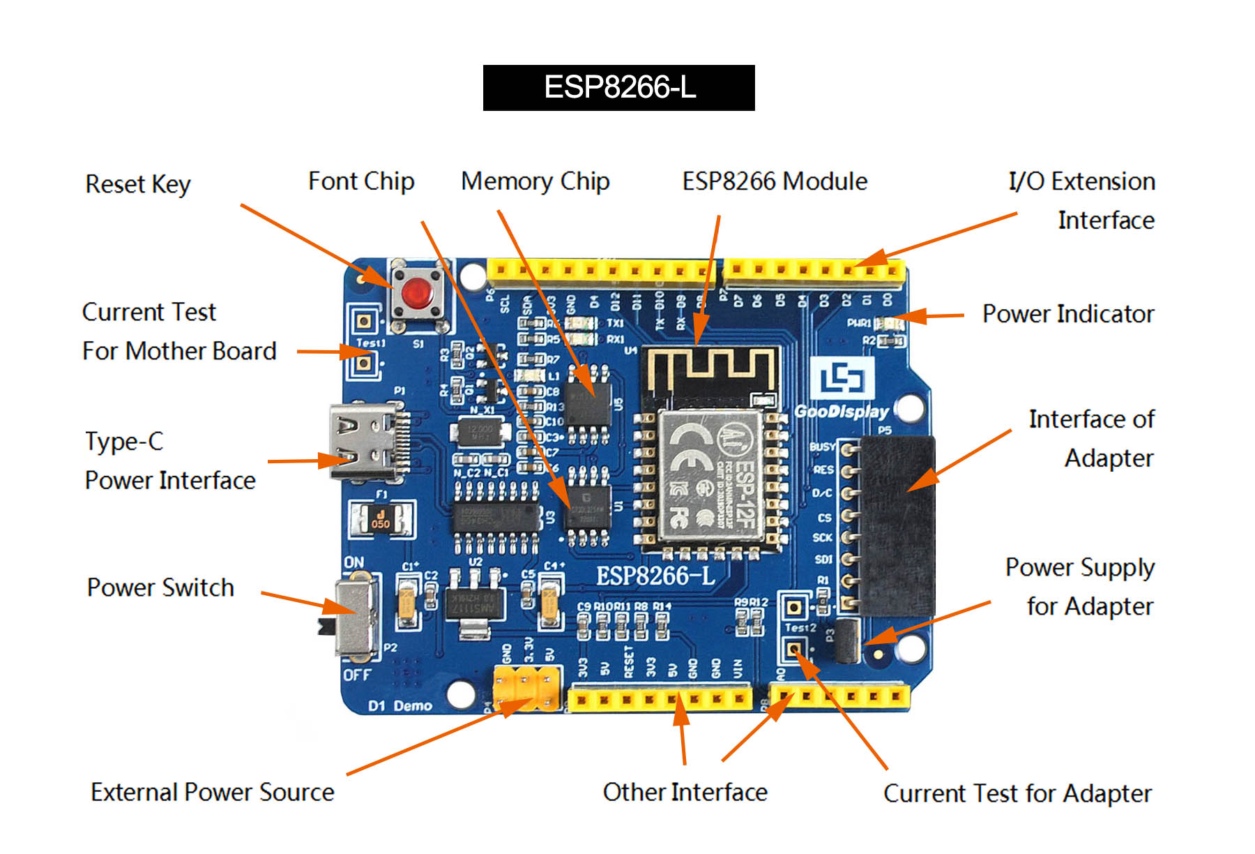 ESP8266-L(C02) evaluation kit is used to help users develop e-paper display projects with provided source code to create more differentiated solutions. It is designed for SPI e-paper display. It supports driving Good Display's black-white e-paper display and three-color (black, white and red/Yellow) e-paper display: 0.97'', 1.54'', 2.13'', 2.66'', 2.7'', 2.9'', 3.71'', 4.2'', 5.83'' and 7.5''. And it is added the functions of USB serial port and LED indicator light, Reset button, font chip, Flash chip and etc. It is only for users to develop and drive electronic paper display screens. The application of WiFi and other functions requires users to develop on their own according to the project. ESP8266-L(C02) development kit consists of motherboard ESP8266-L for EPD and connector board DESPI-C02.