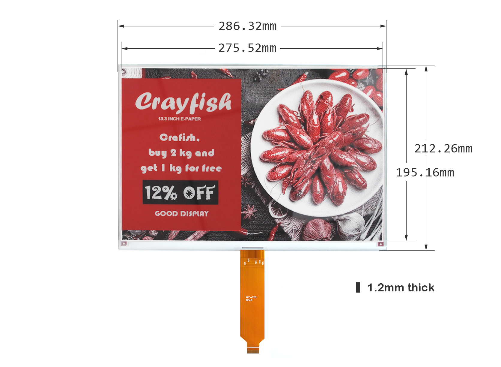 A 13.3-inch E Ink display presents black, white, and red visuals at a crisp HD resolution. Images can be retained indefinitely with ultra-low power consumption, making it an ideal choice for solar-powered or battery-operated devices. Whether for industrial instruments, e-readers, or electronic menus, this display delivers exceptional clarity and performance, adding a touch of technological elegance to your projects! |