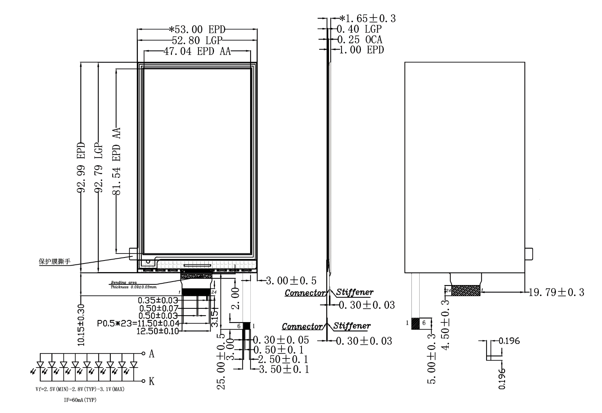 | OUTLINE SIZE(mm) | 92.99x53.00x1.65 | FRONT-LIT CIRCUIT MODE | Parallel connection | ||