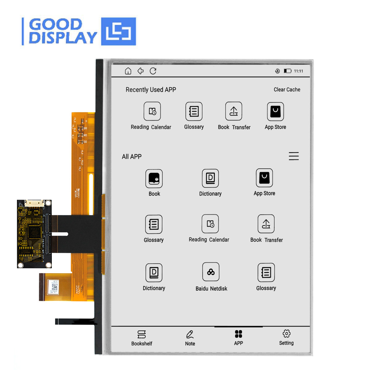 This 11.6-inch ePaper module features a 960×640 resolution on a glass active matrix TFT substrate, delivering vibrant color e-ink effects. With an active display area of 244.51 x 163.01 mm and a pixel density of 99 PPI, it clearly renders content in black, white, red, and yellow.