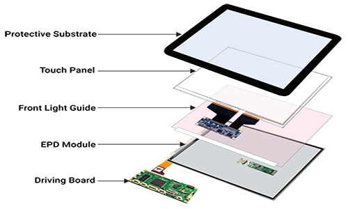 Examples might include combining a driving board, e-paper display, front light, touch screen and cover glass into a cohesive unit.